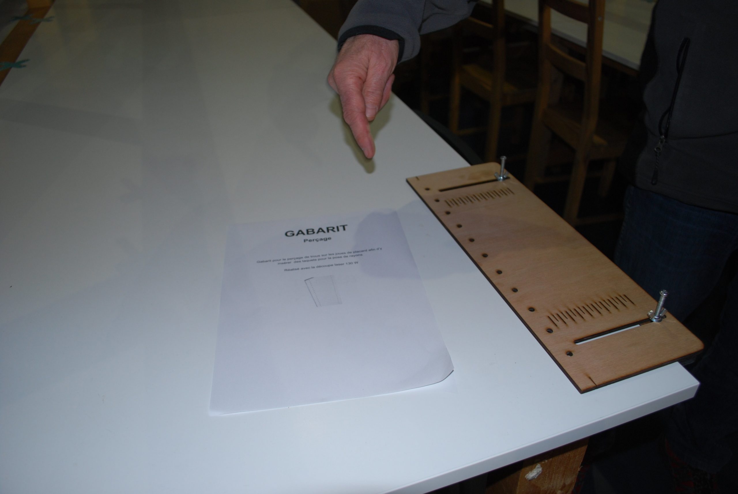 • Le gabarit (pour perçage) : un gabarit pour le perçage de trous sur les joues de placard afin d’y insérer des taquets pour la pose de rayons. Cet outil simple et pratique a été réalisé avec la découpe laser 130 w.