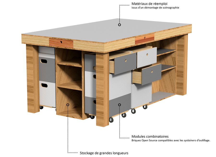 Il contient des rangements accueillant les outils de base (pinces, clés, marteaux, etc.) ainsi que le stock communautaire de quincaillerie. Au centre de l’établi, un grand caisson permet de stocker les profils des projets en cours. Son dessin permet d’accueillir un ensemble de machines en présence, tout en facilitant leur transport dans les véhicules pour les missions extérieures.