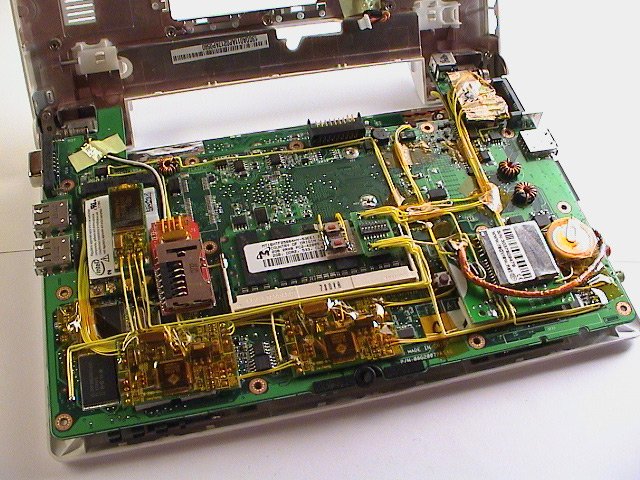 Il est un peu en mauvais état mais on pourrait le modifier, l’augmenter, qu’en dites-vous ? On a de quoi le réparer : un chargeur de récup, un clavier qui va bien… et j’ai déjà d’autres idées : on pourrait en faire un ordinateur « tout terrain » pour les interventions, capable de tout faire, de protéger ses données … ah voila justement j’ai trouvé des choses à rajouter dans notre stock : une 2eme carte wifi, un tuner TNT qui pourra servir d’analyseur d’ondes radio, une carte GSM pour envoyer des SMS ou des appels depuis l’ordinateur, un lecteur de carte à puces… et un hub USB. On va le souder à l’intérieur et simplement rajouter ces éléments.